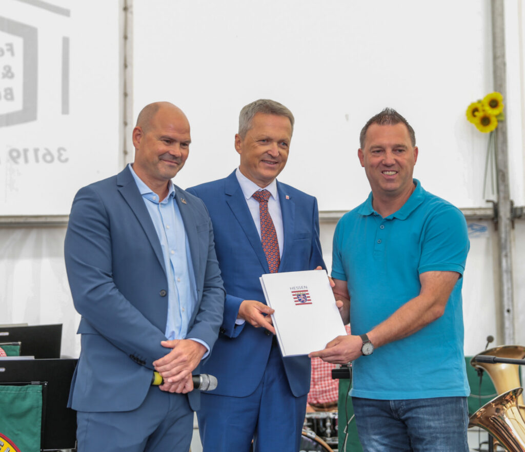 Die Feierstunde im Festzelt begann mit Grußworten aus der Politik. Bürgermeister Hauke Schmehl und Ortsvorsteher Kai Habermann hießen zahlreiche Gäste willkommen, unter ihnen auch Vize-Landrat Patrick Krug (SPD) sowie Staatssekretär Martin Rößler (CDU). Rößler überreichte Zell die Freiherr-vom-Stein-Ehrenurkunde des Landes Hessen. „Zell mit seinen 650 Menschen ist ein kleiner Stadtteil, aber ganz groß, wenn es um Zusammenhalt und gemeinschaftliches Anpacken geht“, betonte Rößler. Er hob auch das 90jährige Bestehen der Freiwilligen Feuerwehr und das 55jährige Jubiläum der Jugendfeuerwehr hervor. Sein Wunsch: Wenn Geselligkeit und Tatkraft an die nächste Generation weitergegeben würden, sei Zell auch beim nächsten Jubiläum noch so liebens- und lebenswert wie heute.
