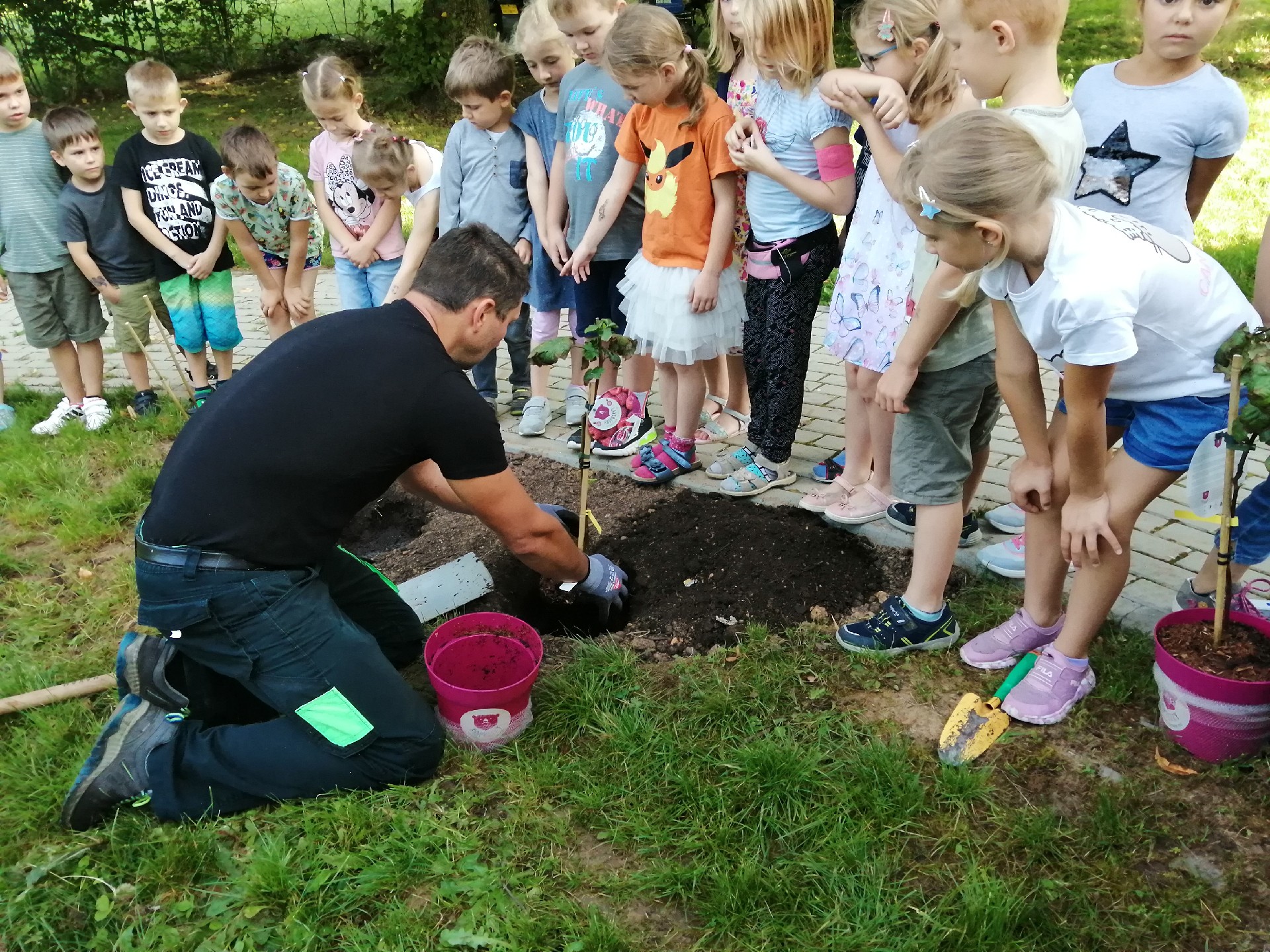 Der Vorsitzende des Schulelternbeirats, Manuel Lauer, begrüßte die Kinder mit zwei Himbeersträuchern für den Obstgarten der Grundschule. Hier pflanzt jede neue Klasse einen Baum oder einen Strauch, der im Lauf der Grundschulzeit bei guter Pflege Früchte tragen soll – übrigens ganz ähnlich wie beim Lernen. Mit Hilfe von Hausmeister Andreas Treiber konnten die Kinder ihre Sträucher setzen und wässern. Jetzt besuchen die Kinder „ihre Sträucher“ regelmäßig, um sie zu beobachten und zu gießen. Genau wie die Kinder haben ihre beiden Setzlinge bereits erste Wurzeln in der Schule geschlagen.