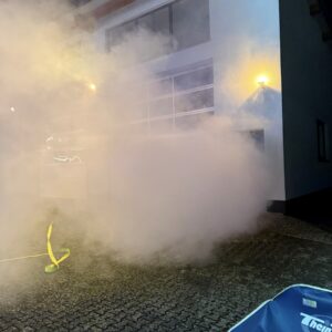 Nach erfolgreicher Rettung aller vermissten Personen und „Löschung“ des Brandes schloss sich eine ausführliche Nachbesprechung an. Dabei wurden insbesondere das Vorgehen im Innenangriff, die Funkkommunikation zwischen den Einheiten und der Einsatz der neuen Nebeltechnik analysiert und bewertet.