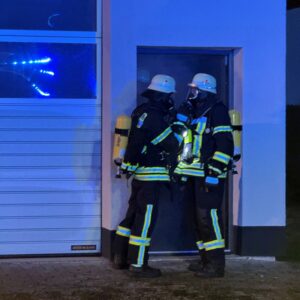 Kurz darauf stand fest, dass sich noch zwei Personen in der verrauchten Halle befanden. Angriffstrupps beider Wehren drangen unter schwerem Atemschutz zur Menschenrettung in das Gebäude vor. Im Verlauf der Übung stellte sich heraus, dass eine der Personen verletzt aus der Halle geflüchtet war und in unmittelbarer Umgebung gestürzt war. Die Einsatzkräfte mussten die verletzte Person zunächst auffinden und erstversorgen, bevor sie an den fiktiven Rettungsdienst übergeben wurde.