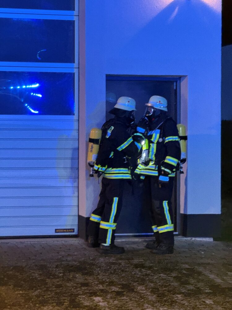 Kurz darauf stand fest, dass sich noch zwei Personen in der verrauchten Halle befanden. Angriffstrupps beider Wehren drangen unter schwerem Atemschutz zur Menschenrettung in das Gebäude vor. Im Verlauf der Übung stellte sich heraus, dass eine der Personen verletzt aus der Halle geflüchtet war und in unmittelbarer Umgebung gestürzt war. Die Einsatzkräfte mussten die verletzte Person zunächst auffinden und erstversorgen, bevor sie an den fiktiven Rettungsdienst übergeben wurde.