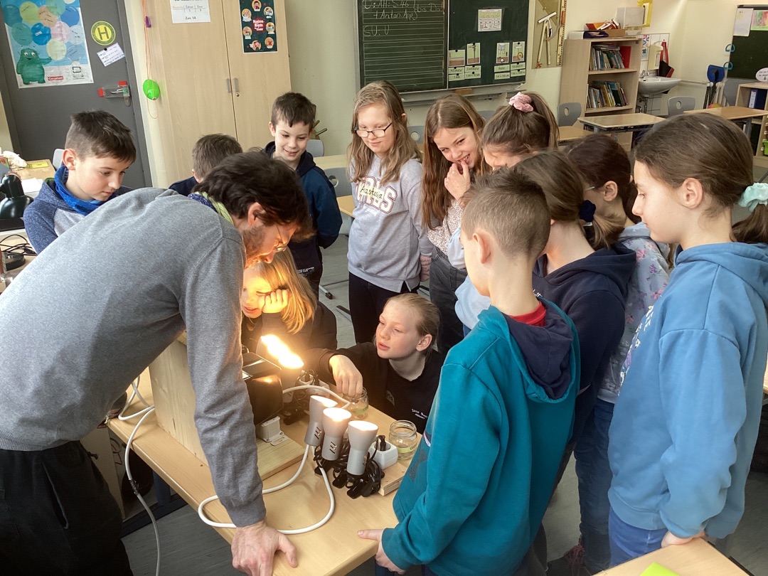 Es folgte ein Experiment zum Stromverbrauch, bei dem LED-Birnen, herkömmliche Glühbirnen und ein Wasserkocher in Bezug auf ihren Stromverbrauch verglichen wurden. Dass die LED-Birnen wohl am wenigsten Strom verbrauchen würden, darüber waren sich alle Kinder einig, aber wie viel Strom ein Wasserkocher wirklich verbraucht, bis das Wasser endlich kocht, beeindruckte alle nachhaltig.