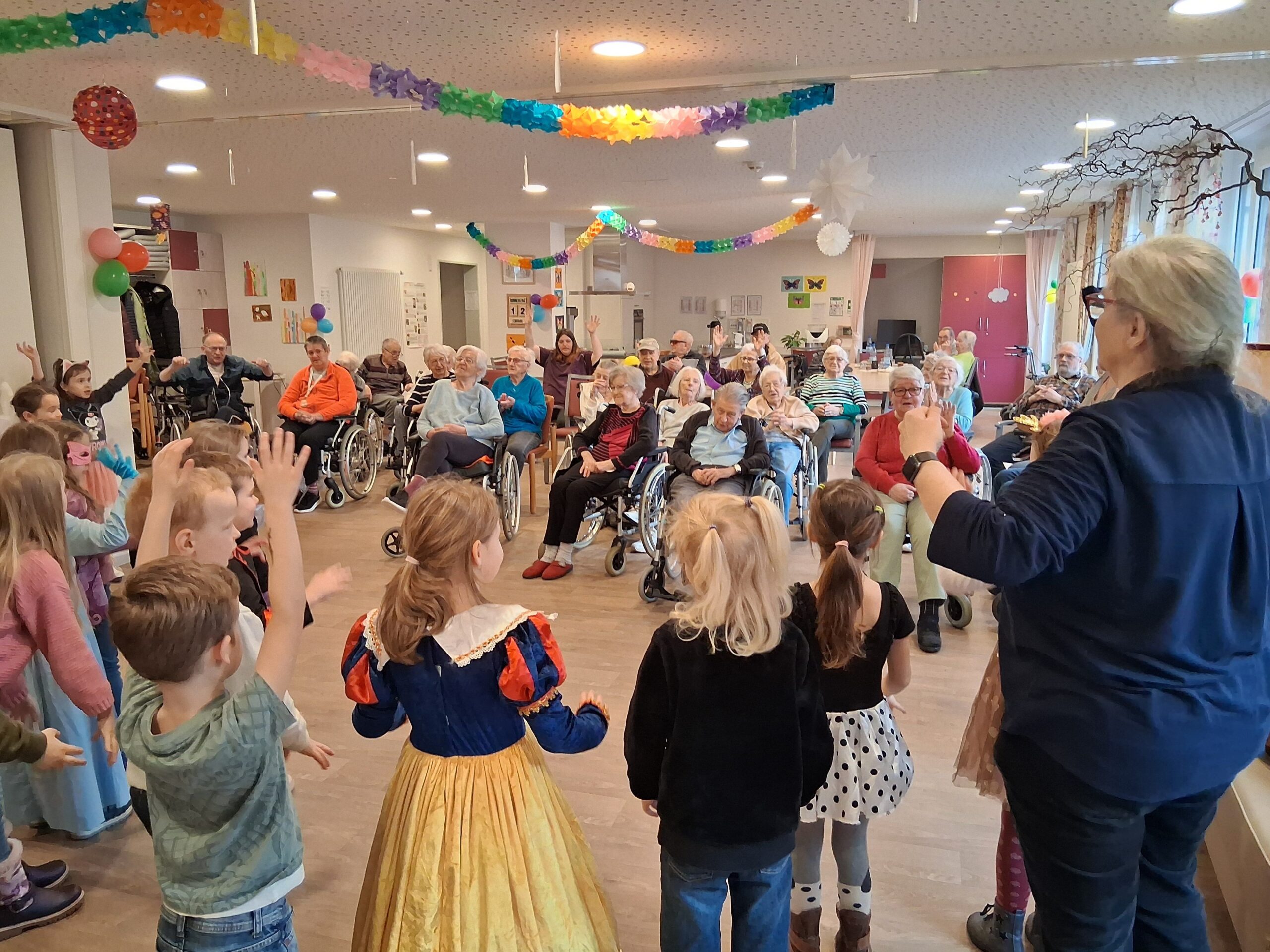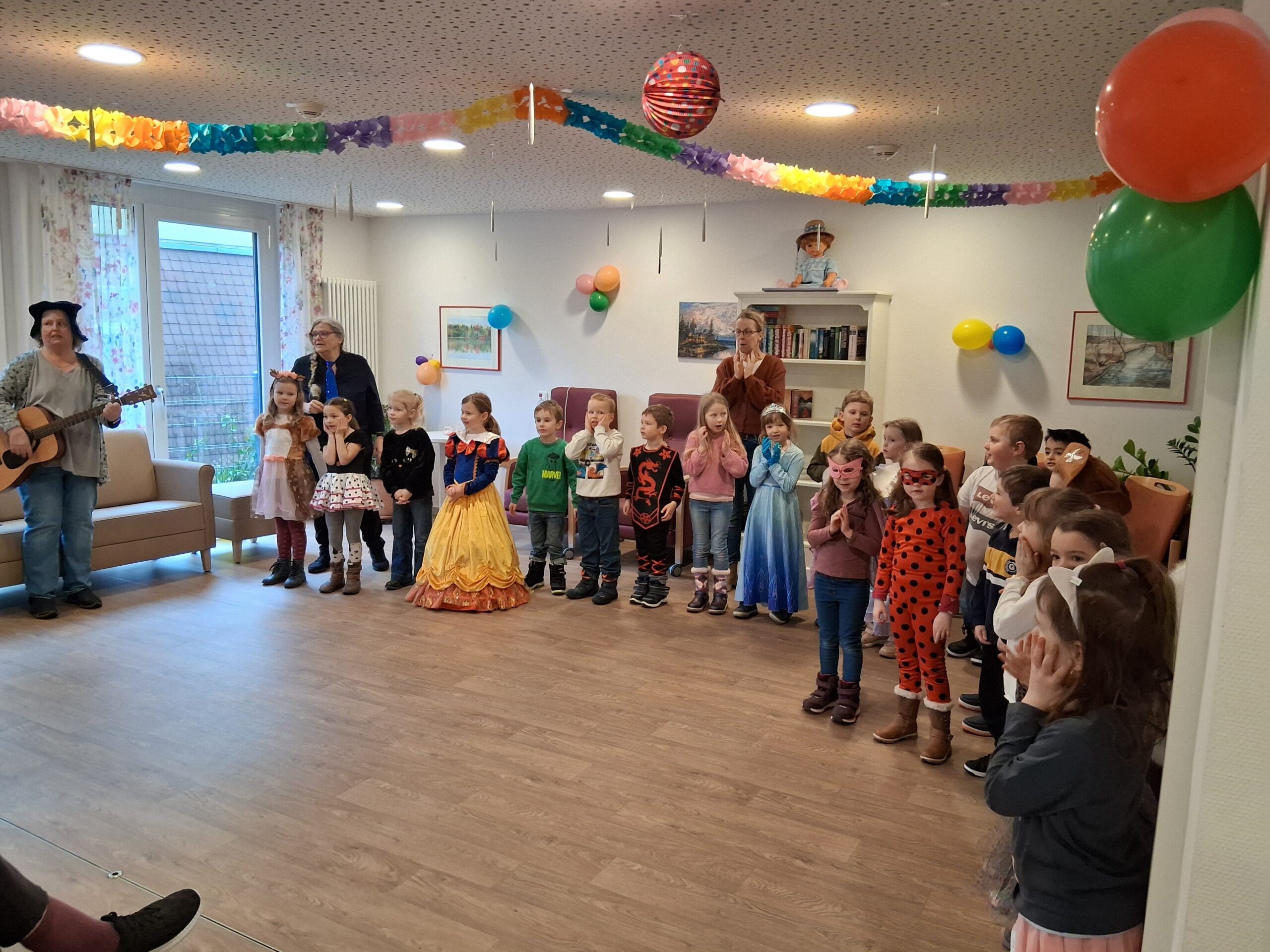Bunt, fröhlich und voller Musik wurde es im Haus Schlossblick in Romrod, als die „Elefantenkinder“ der ev. Kita Romrod an Weiberfasching zu Besuch kamen. Im Rahmen der Faschingszeit sorgten die Kinder mit zwei Tänzen, Liedern und viel guter Laune für eine unvergessliche Aktion bei den Bewohnerinnen und Bewohnern.