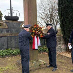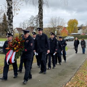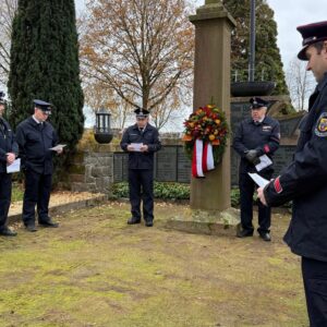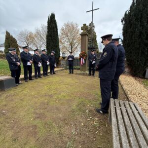 So versammelten sich am frühen Sonntagnachmittag Mitglieder der Freiwilligen Feuerwehr, Ortsvorsteher Fabian Musch sowie zahlreiche Bürgerinnen und Bürger am Friedhof. Zwölf Einsatzkräfte begleiteten die Kranzniederlegung, die durch die Feuerwehr würdevoll vorgenommen wurde.