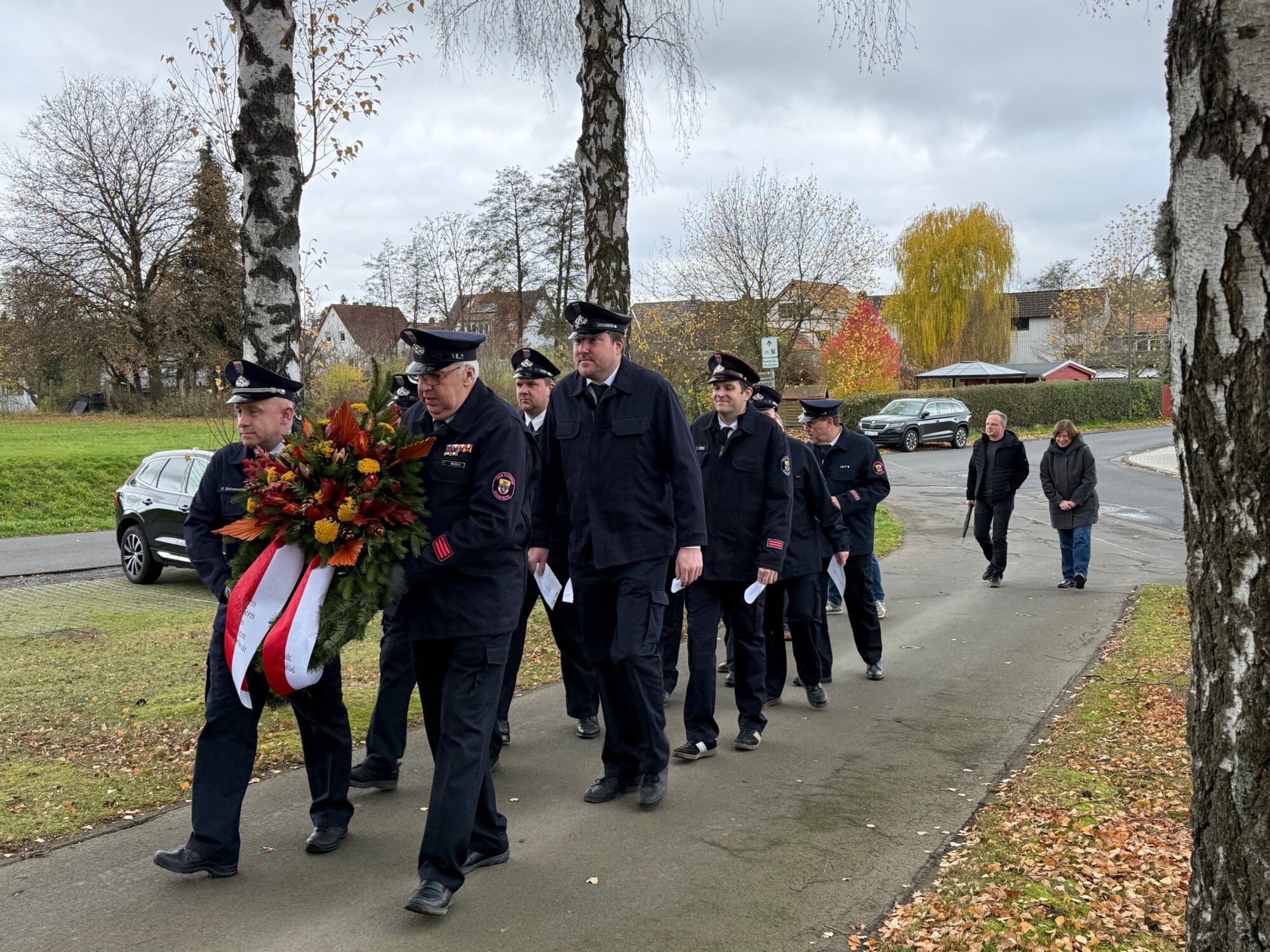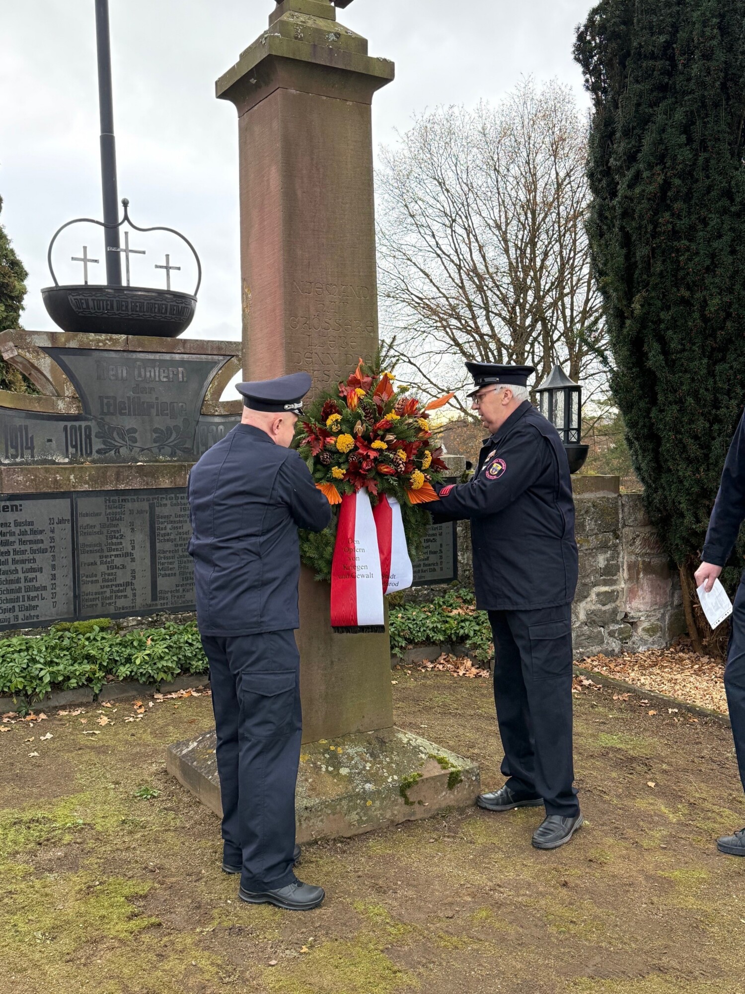 So versammelten sich am frühen Sonntagnachmittag Mitglieder der Freiwilligen Feuerwehr, Ortsvorsteher Fabian Musch sowie zahlreiche Bürgerinnen und Bürger am Friedhof. Zwölf Einsatzkräfte begleiteten die Kranzniederlegung, die durch die Feuerwehr würdevoll vorgenommen wurde.