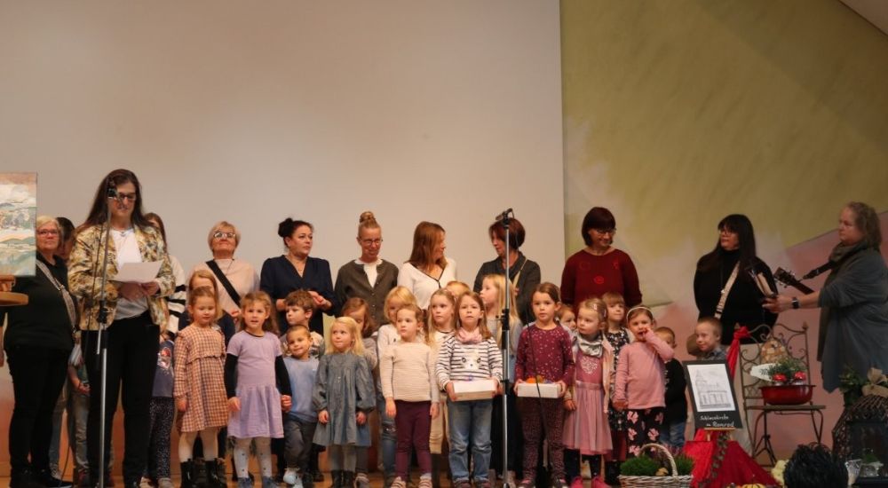 Dafür versammelten sich die Kinder und einige der pädagogischen Fachkräfte der Kindertagesstätte nach dem Gottesdienst im Bürgerhaus. Das erste Lied, „Regenbogen, Regenbogen“, wurde von der pädagogischen Fachkraft Rike Greb auf der Gitarre begleitet. Während des Liedes standen die Kinder gemeinsam mit den Erzieherinnen auf der Bühne und schwangen bunte Tücher über ihren Köpfen – ein fröhliches und farbenfrohes Regenbogenbild erfüllte den Saal.