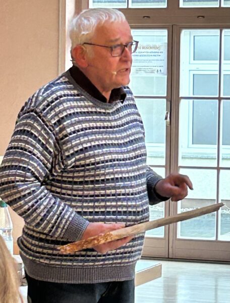 Höhepunkt des Nachmittags war der Auftritt des „Mundartpoets“ Karl Wilhelm Becker aus Lehrbach. Neben Anekdoten und Erklärungen zu dem heimischen Dialekt hatte er seinen „Bredbrogge“ als Laptop, „zwo scheppe Schippe“ und auch ein „rollendes R“ mitgebracht. Becker sorgte für eine ausgelassene Stimmung und hatte etliche Lacher auf seiner Seite, als er über „Haa“, „Säu“ und die Frage „Wo widde de dei Haa hi hu“ simbelierte (nachdachte).