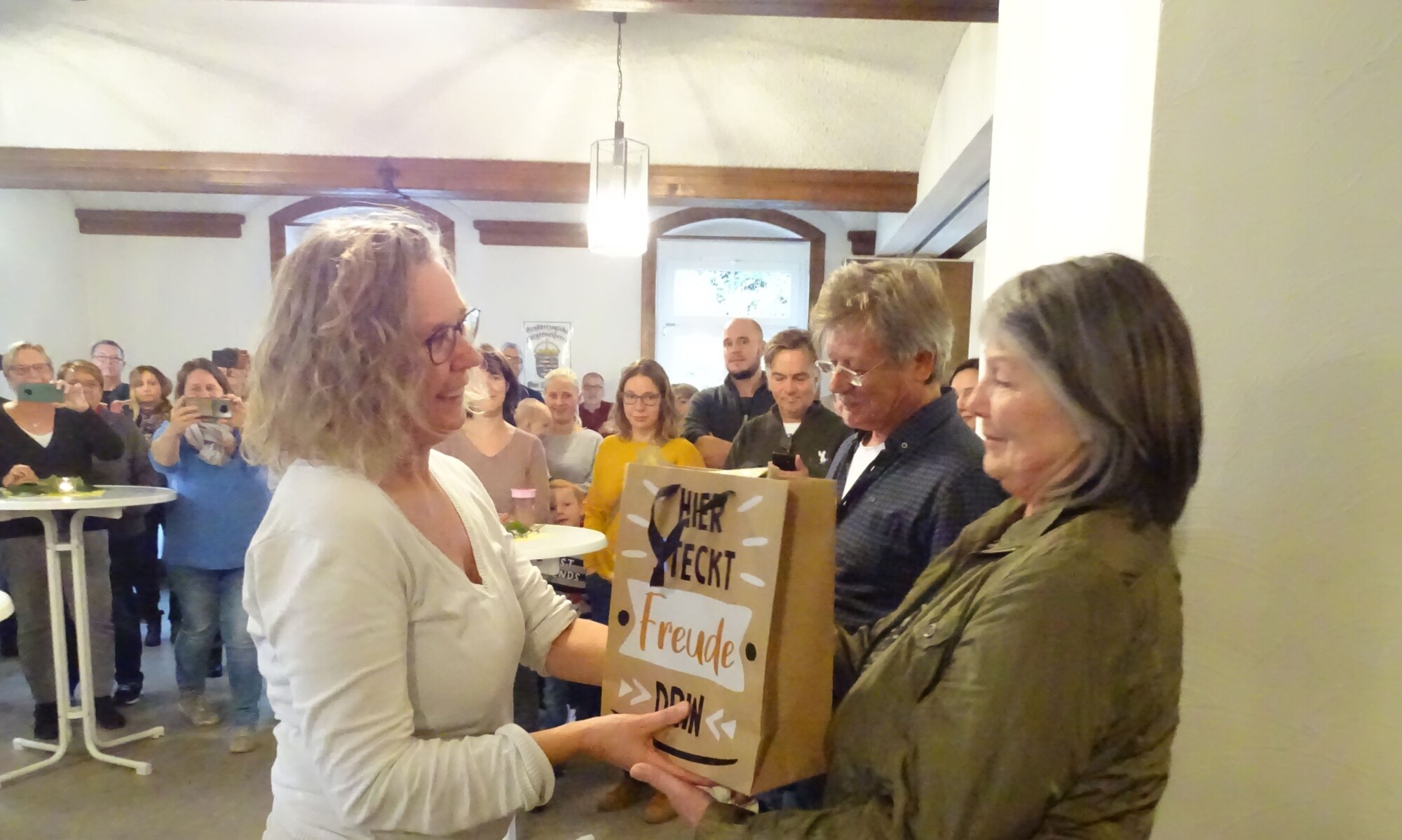 Jeder hatte etwas mitgebracht; am Ende zog sich geradezu in einer „Endlos-Schleife“ ein Buffet mit allem Drum und Dran durch das Dorfgemeinschaftshaus. Kerzen flackerten über Käse, Hausmacherworscht, über Rührei mit Schinken, über schmucken Gläsern mit selbstgemachter Marmelade, alles bunt und herbstlich dekoriert. Der Clou: Die Brötchen, „die der Rolf selbst gebacken hat“, verrät einer der Anwesenden. Deswegen waren in den Tagen zuvor unzählige Brötchen in der Bäckerei Göttlicher bestellt worden – nicht nur von privaten Haushalten, sondern auch von der Burschenschaft, der Feuerwehr, vom Obst- und Gartenbauverein. All diese Brötchen wurden sorgfältig aufbewahrt für das große Abschiedsbuffet. An besagtem Samstag holten Tochter und Schwiegersohn das Ehepaar Göttlicher ins DGH. Die Tür zum Saal ging auf, dort standen im Halbkreis die vielen Bergdörfler, sofort setzte der gesungene Willkommensgruß ein. Vor dem Ansturm aufs Buffet überbrachten Ortsvorsteherin Ulrike Geisel und einige Vereinsvorsteher ihr Dankeschön. Zurückgegeben wurde das Danke von Rolf Göttlicher in kurzen Worten, dann brach die Stimme, die Rührung überwältigte das Ehepaar.
