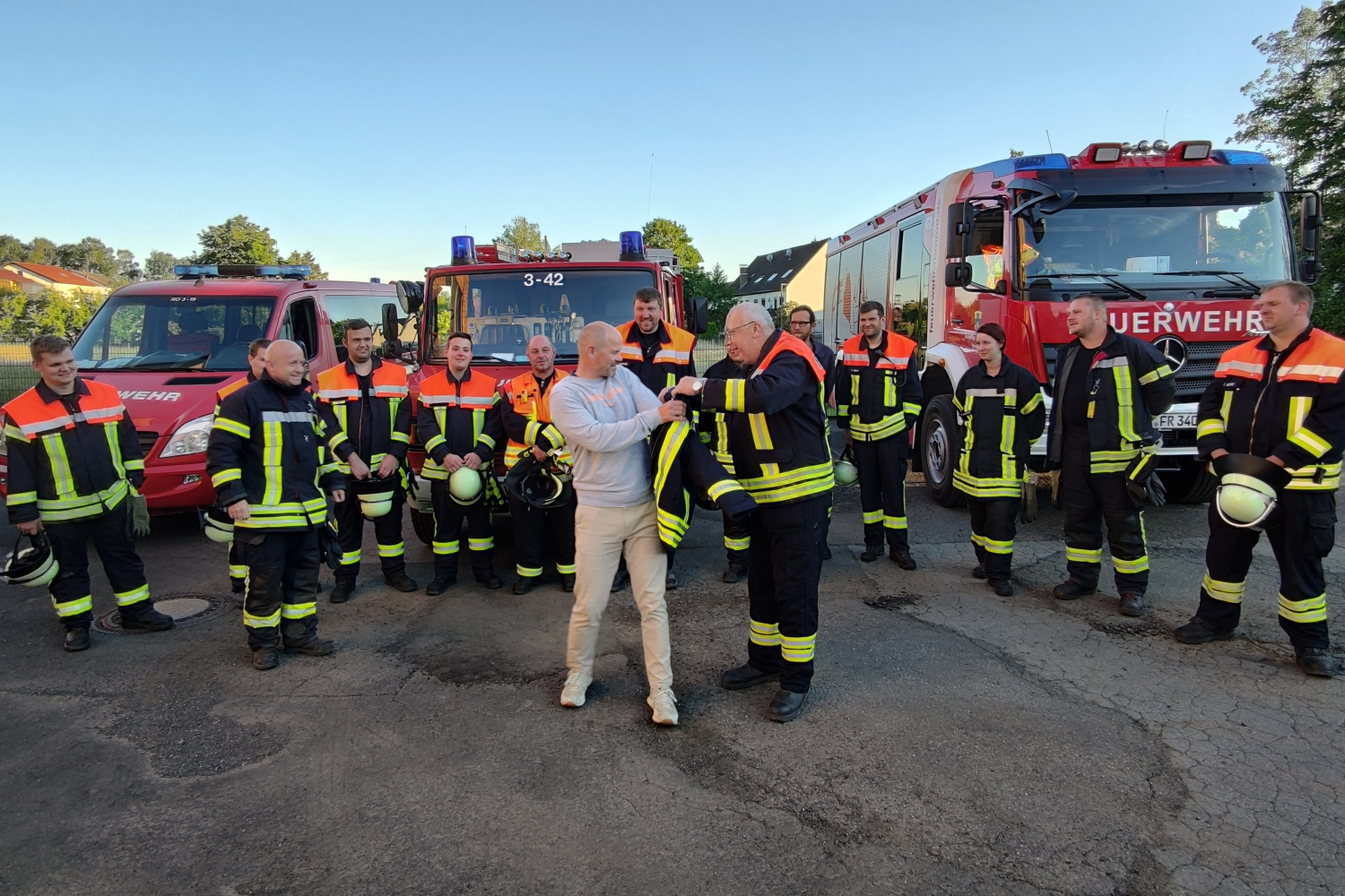 Romrods Bürgermeister Hauke Schmehl informierte sich vor Ort über die Ausbildung der Feuerwehrleute. Diese hatten mit Unterstützung des örtlichen Fördervereins eine Überraschung für Schmehl vorbereitet. So erhielt der Bürgermeister seine eigene Feuerwehr-Einsatzjacke mit reflektierendem Amts- und Namensschild.