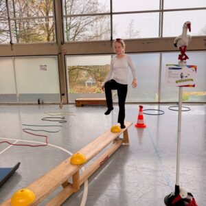 Auch in der Antarktis ging es sportlich weiter: Auf dem Bauch rutschten die kleinen Turnerinnen und Turner wie Pinguine einen Eisberg hinunter oder robbten wie Robben über die glatten Eisfelder. In Südamerika wurde Geschicklichkeit großgeschrieben – hier balancierten die Kinder ein Säckchen auf dem Kopf über eine wacklige Bank, ganz wie die fleißigen Blattschneiderameisen, und testeten anschließend ihre Treffsicherheit wie ein bunter Papagei.