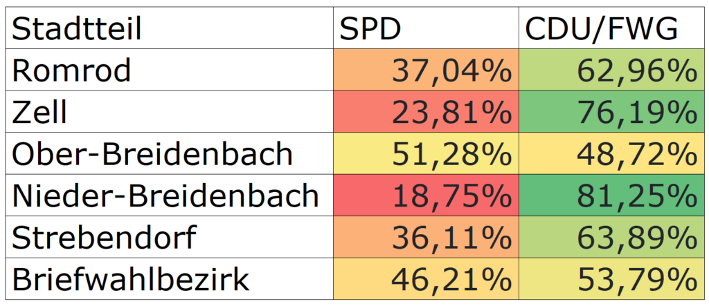Die Stadtteile im einzelnen haben wie folgt gewählt (Briefwahl ist ein eigenständiger Wahlbezirk und wird nicht den Ortsteilen zugerechnet):