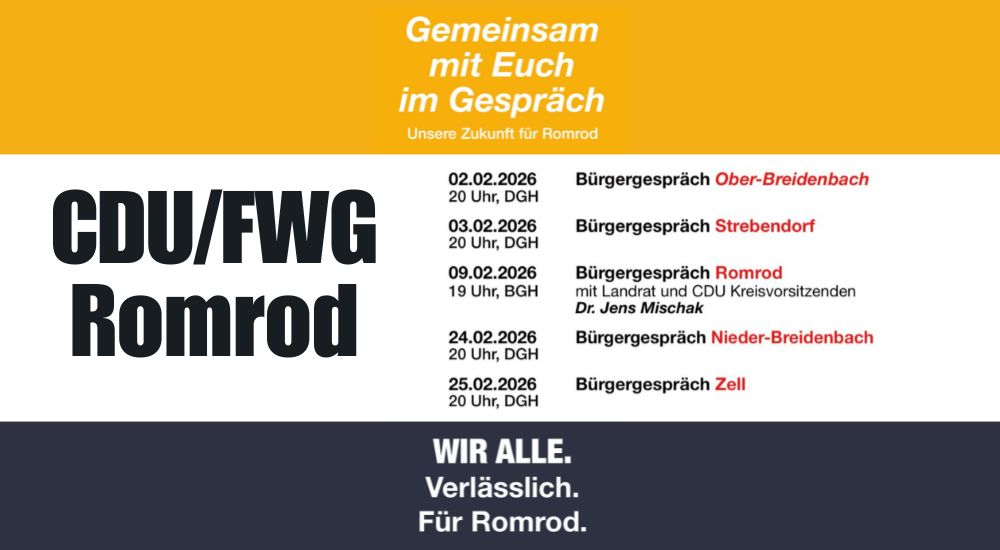 Unter dem Motto „Gemeinsam mit euch im Gespräch“ lädt die CDU/FWG-Fraktion Romrod in allen Romröder Ortsteilen zu Bürgergesprächen vor der Kommunalwahl ein. Die Kandidaten der CDU/FWG-Fraktion und Bürgermeister Hauke Schmehl stehen für Fragen, Anregungen und einen persönlichen Austausch zur Verfügung.