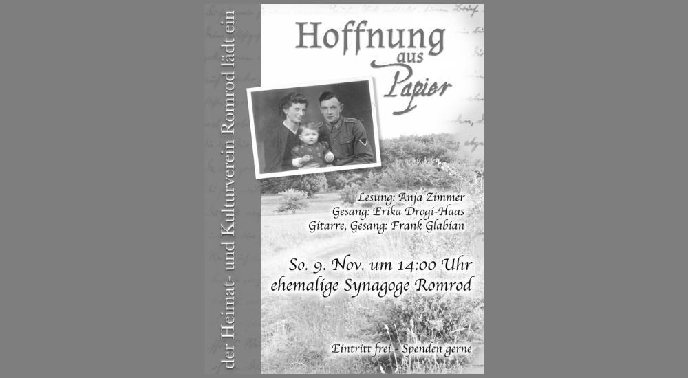 Der Heimat- und Kulturverein Romrod lädt ein zu einer Lesung mit Musik am Sonntag, 9. November, um 14 Uhr in der ehemaligen Synagoge in Romrod, Alsfelder Straße 1 (am Ocherbach). Anja Zimmer liest aus ihrem Romand „Hoffnung aus Papier“, ein Nachkriegsroman über Liebe, Freundschaft und Hoffnung.