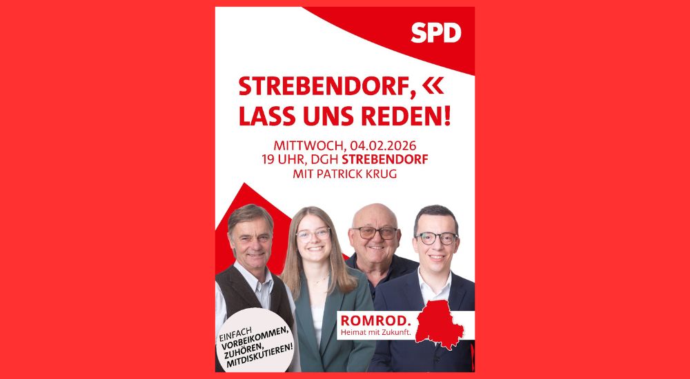 Was braucht es, damit Romrod eine Heimat mit Zukunft bleibt? Darüber möchte die SPD Romrod ins Gespräch kommen und eigene Schwerpunkte vorstellen. Zum Zuhören und Mitdiskutieren lädt sie am Mittwoch, den 4. Februar 2026 ab 19 Uhr ins Dorfgemeinschaftshaus Strebendorf ein. Die Veranstaltung soll dazu dienen darüber zu sprechen, was in Romrod gut läuft und wo es noch Verbesserungspotenzial gibt. Eine Perspektive auf die Kreispolitik wird anschließend Spitzenkandidat Patrick Krug ergänzen.