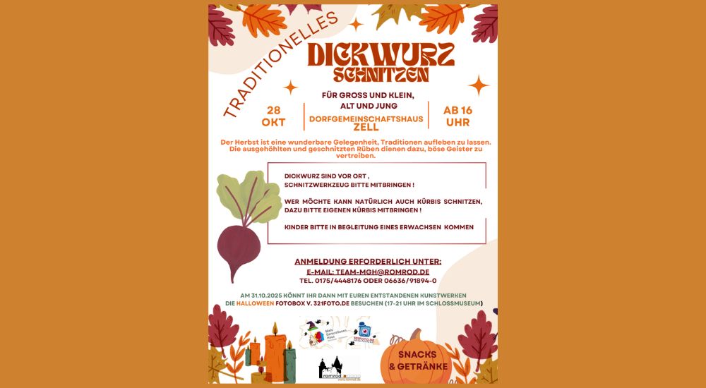 Am 28. Oktober lädt das Mehrgenerationenhaus Romrod (MGH) Alt und Jung zum Dickwurz-Schnitzen ins Dorfgemeinschaftshaus Zell ein. Los geht’s um 16 Uhr.