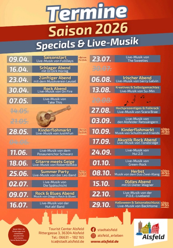 Der Alsfelder Feierabendmarkt ist der perfekte After-Work-Treffpunkt! Jeden Donnerstag bis 29. Oktober (siehe untenstehende Abbildung) verwandelt sich der Alsfelder Marktplatz von 16 bis 20 Uhr in eine Oase aus gutem Essen, kühlen Getränken und stimmungsvoller Live-Musik.