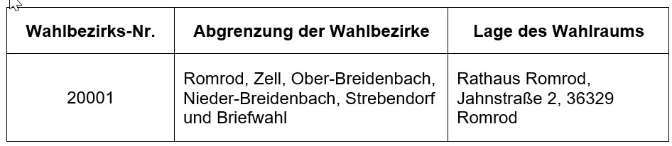 In den Wahlbenachrichtigungen, die den im Wählerverzeichnis eingetragenen Wahlberechtigten bis zum 22.02.2026 übersandt werden, sind der Wahlbezirk und der Wahlraum angegeben, in dem die Wahlberechtigten zu wählen haben. Barrierefrei zugängliche Wahlräume sind mit einem Rollstuhlpiktogramm gekennzeichnet. Ein Verzeichnis der barrierefrei zugänglichen Wahlräume liegt während der allgemeinen Öffnungszeiten bei der Stadtverwaltung Romrod, Jahnstraße 2, 36329 Romrod zur Einsichtnahme aus.