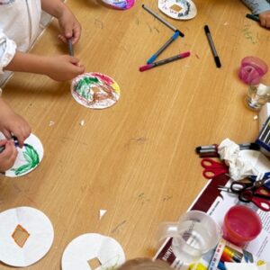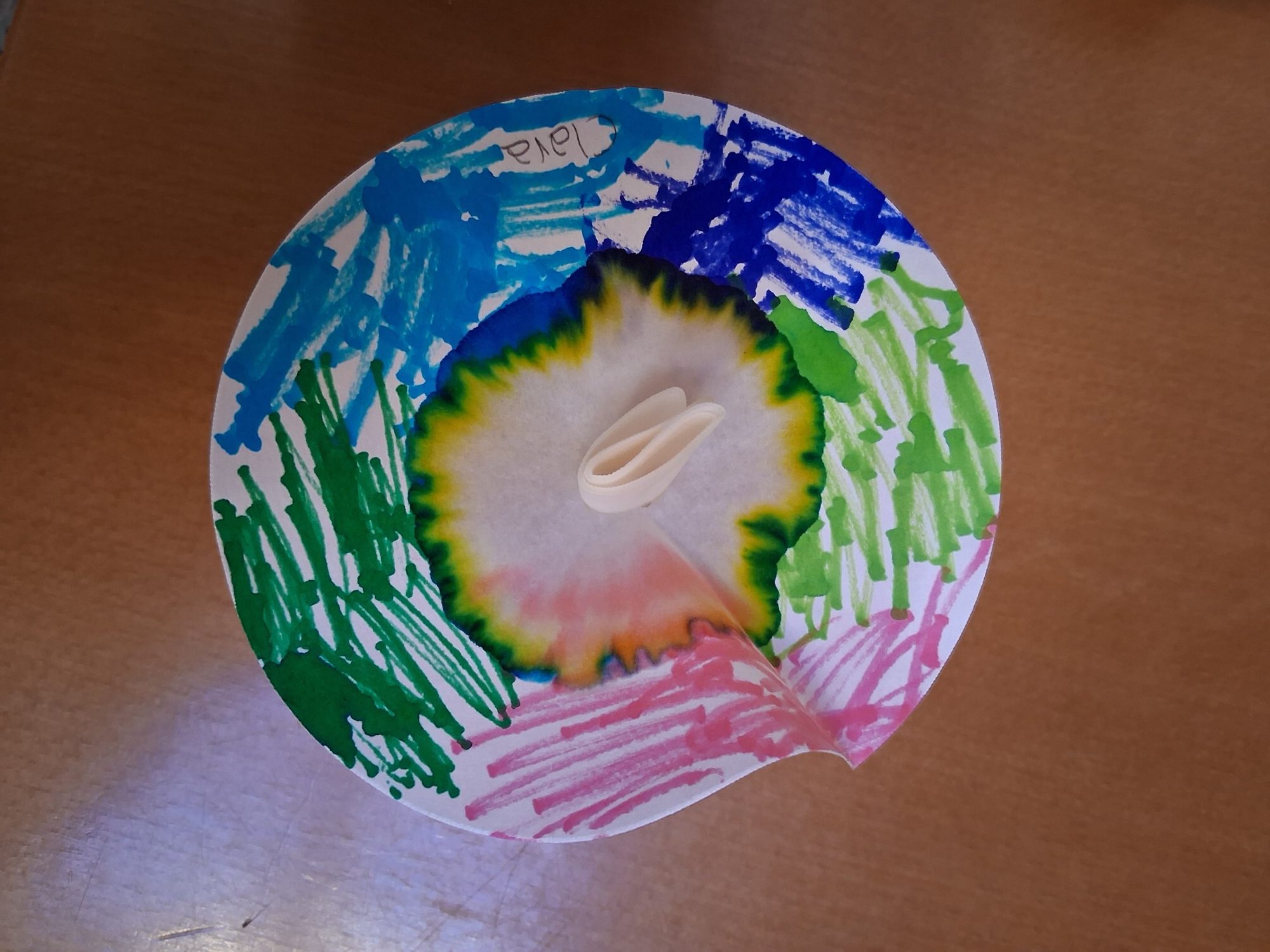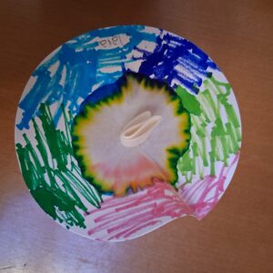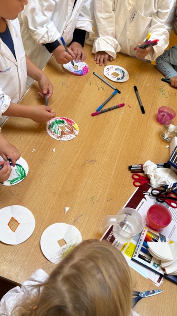 Mit Filzstiften malten die Kinder auf Kaffeefilterpapier – und staunten, als durch die Berührung mit Wasser plötzlich bunte Kreise und Muster entstanden, die an Blütenblätter erinnerten. So wurde das Prinzip der Farbtrennung (Chromatographie) spielerisch erlebbar gemacht.