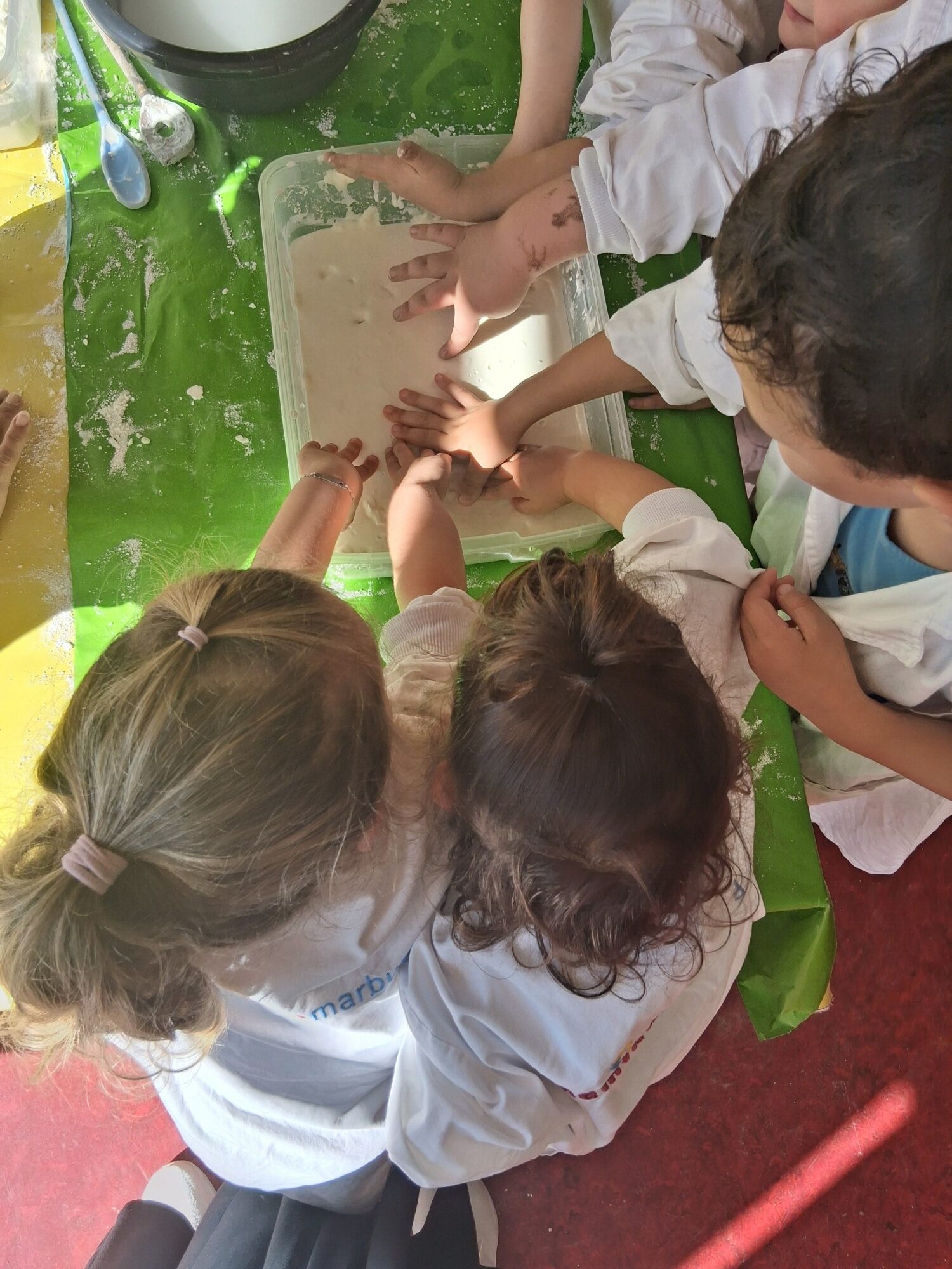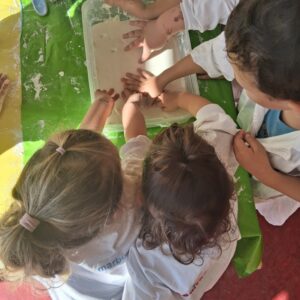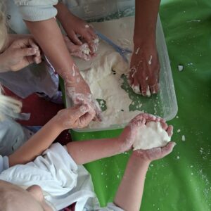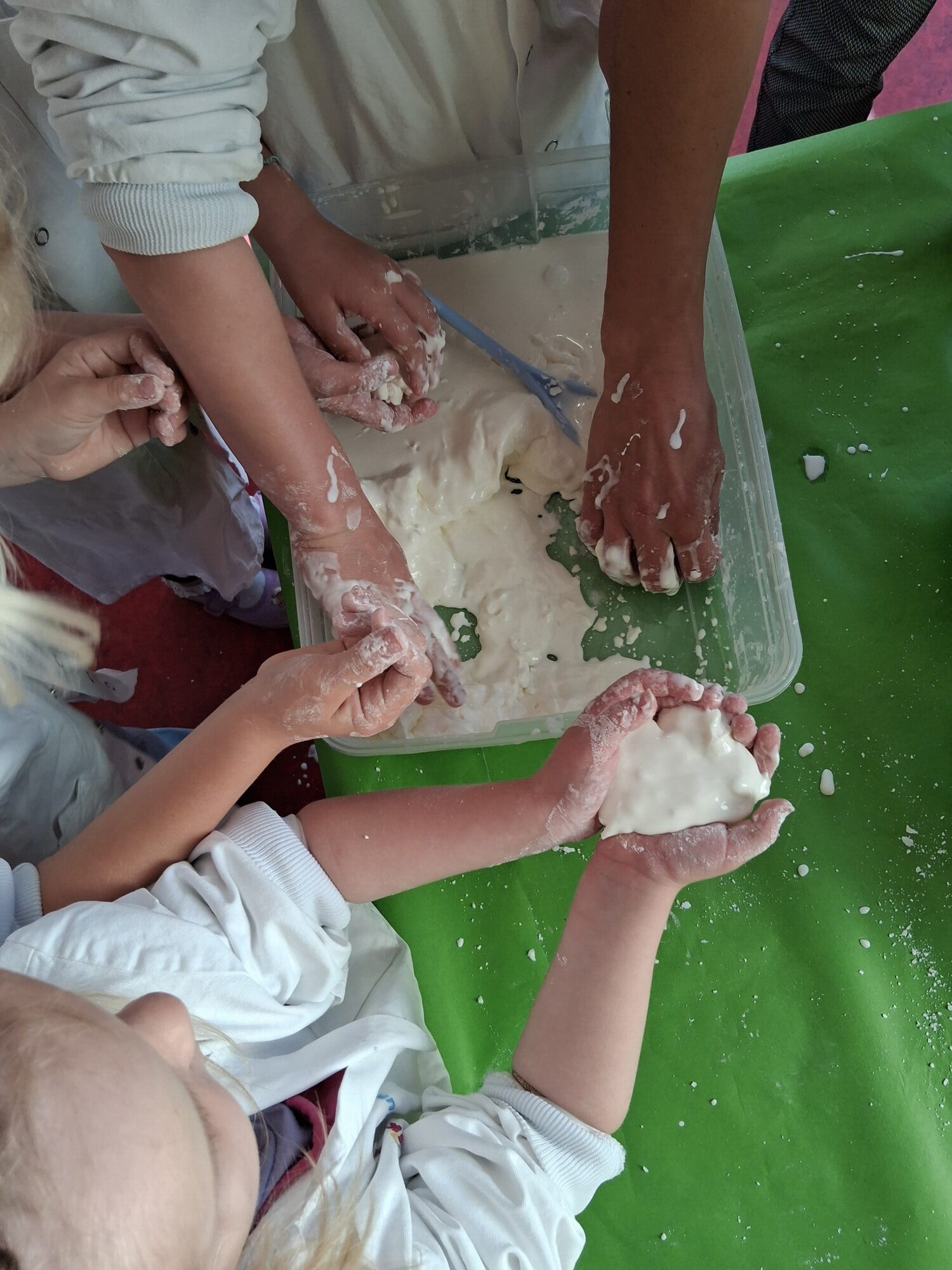 Zum Abschluss wurde es noch einmal richtig spannend: In einer Wanne befand sich eine geheimnisvolle weiße Masse aus Wasser und Maisstärke. Die Kinder waren fasziniert: Je nachdem, wie stark man sie berührte, fühlte sie sich entweder hart wie Stein oder flüssig wie Wasser an. Ein faszinierendes Beispiel für ein sogenanntes nicht-newtonsches Fluid.