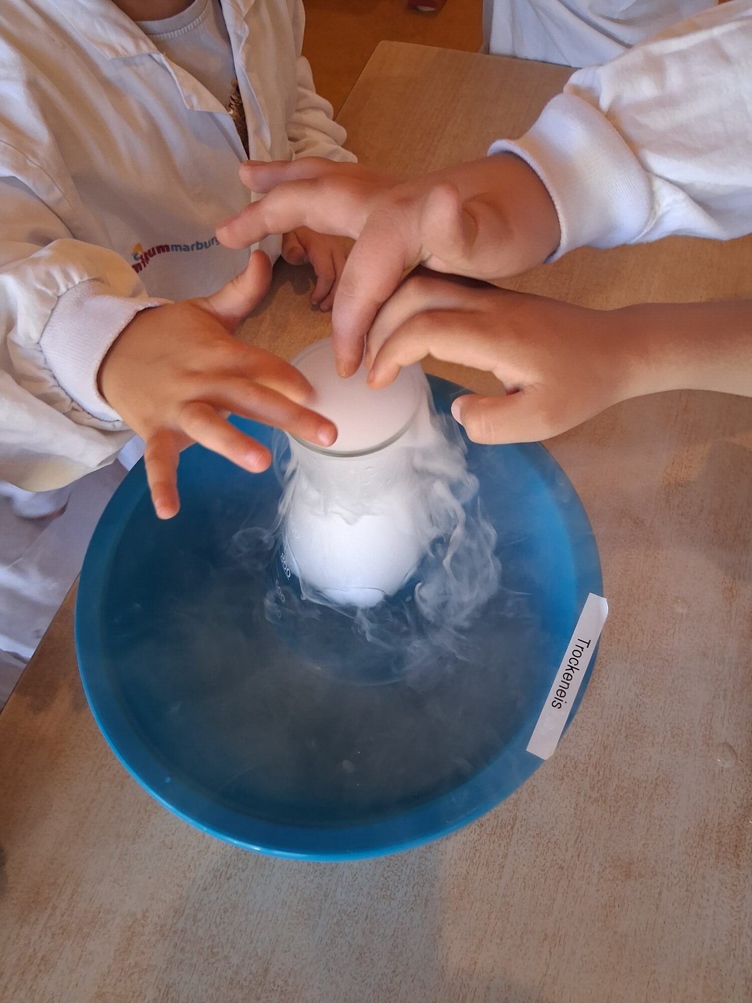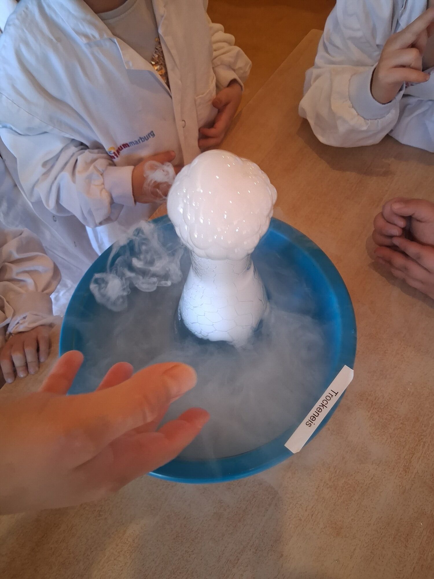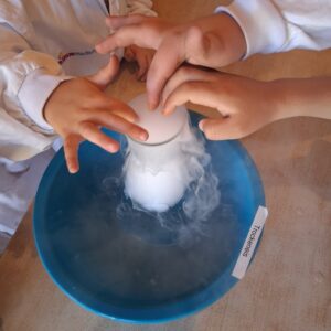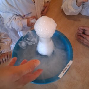 An einer weiteren Station wurde die Magie des festen Kohlenstoffdioxids (Trockeneis) erlebbar: Es dampfte, vibrierte bei Kontakt mit Metall, glitt scheinbar schwebend über glatte Oberflächen und ließ Wasser blubbern. Mit etwas Spülmittel entstand sogar ein brodelnder „Seifenblasen-Vulkan“, dessen dampfgefüllte Blasen auf der Hand zerplatzten – ein echtes Highlight!