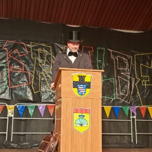Die Moderation übernahmen Daniel „Hoschde“ Kirsch und Ortsvorsteher Kai Habermann, die – stilecht als Kellner verkleidet – durch den Abend führten. Jeden Programmpunkt „servierten“ sie dem Publikum mit einem persönlichen Gegenstand auf dem Silbertablett. So symbolisierte etwa ein kleiner Kinderschuh gemeinsam mit einem aktuellen Tanzschuh die langjährige Aktivität der Gardetanzgruppe „Blue Devils“. Persönlich begrüßt wurden unter anderem Melanie Steuernagel, Chefin der „Zeller Halbe“, sowie Ehren- und Alterspräsident Otto Ling. Für Melanie Steuernagel hatten die Moderatoren ein besonderes Präsent dabei: Mettbrötchen und ein „Diesel“ – denn, so der augenzwinkernde Kommentar, manche Frauen mögen Blumen eben nicht so sehr.