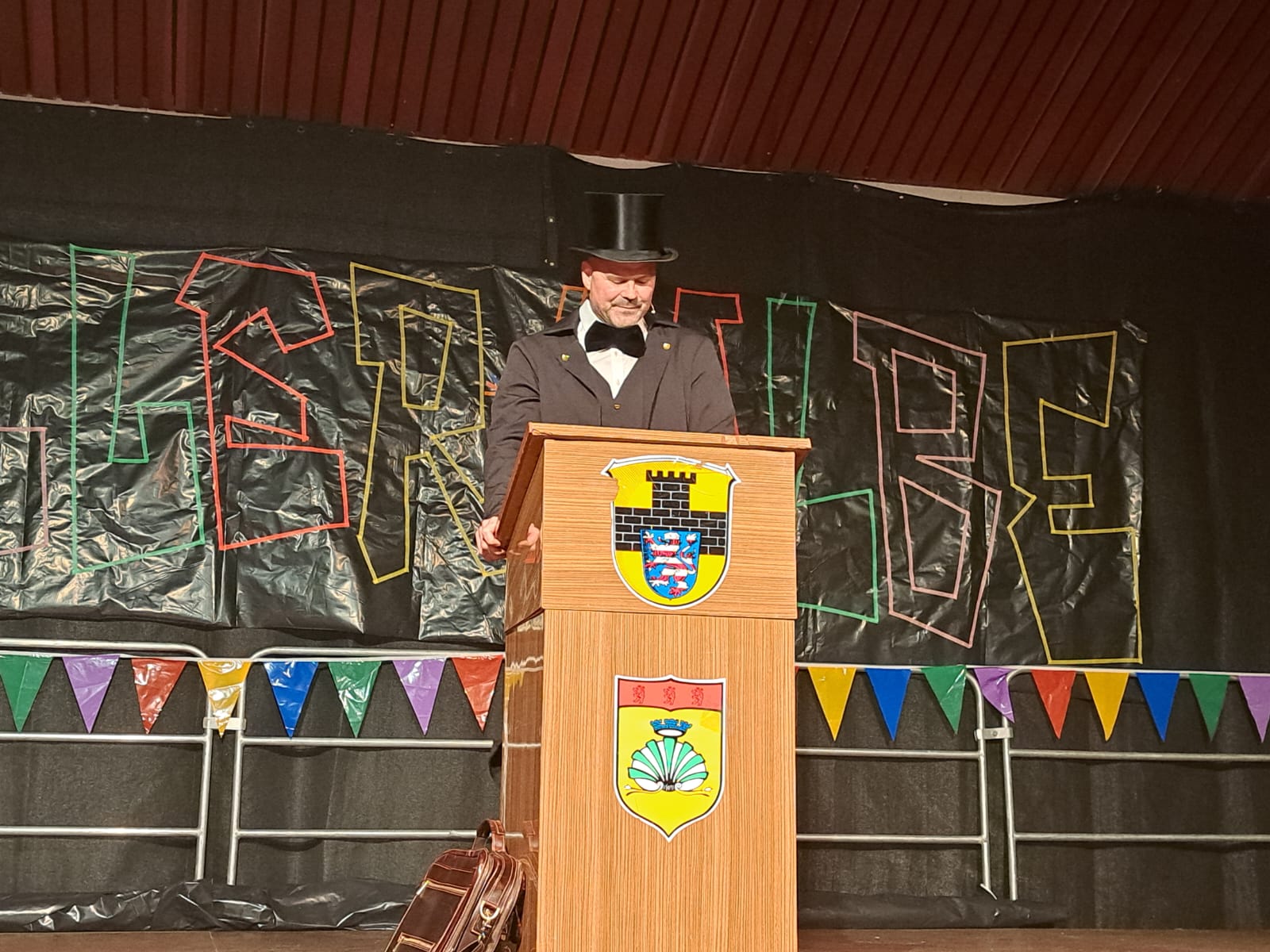 Die Moderation übernahmen Daniel „Hoschde“ Kirsch und Ortsvorsteher Kai Habermann, die – stilecht als Kellner verkleidet – durch den Abend führten. Jeden Programmpunkt „servierten“ sie dem Publikum mit einem persönlichen Gegenstand auf dem Silbertablett. So symbolisierte etwa ein kleiner Kinderschuh gemeinsam mit einem aktuellen Tanzschuh die langjährige Aktivität der Gardetanzgruppe „Blue Devils“. Persönlich begrüßt wurden unter anderem Melanie Steuernagel, Chefin der „Zeller Halbe“, sowie Ehren- und Alterspräsident Otto Ling. Für Melanie Steuernagel hatten die Moderatoren ein besonderes Präsent dabei: Mettbrötchen und ein „Diesel“ – denn, so der augenzwinkernde Kommentar, manche Frauen mögen Blumen eben nicht so sehr.