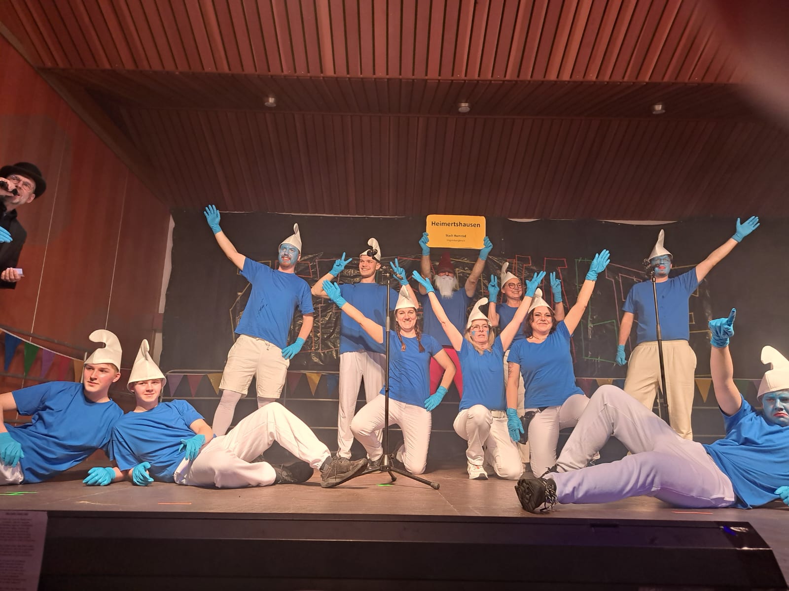 Aus dem benachbarten Heimertshausen, das in diesem Jahr keine eigene Faschingssitzung hat, kamen Vader Abraham und seine blau-weißen Schlümpfe zu Besuch. Die gelungene Darbietung bestritten Sascha Zarges-Graf, Regina Nahrgang, Uli Schäfer, Alfred Schmidt, Markus Semmler, Lars Zarges-Graf, Manuela Zarges-Graf, Melanie Zarges-Graf, Simon Bräutigam, Jakob Engel, Jannes Engel, Nicole Gebauer, Max Kinscher, Horst Krick und Sybille Krick.
