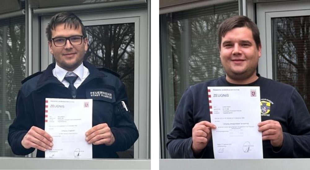 Der Stadtbrandinspektor Björn Müller sowie seine beiden Stellvertreter gratulieren Lukas Ziegler und Kevin Weiß herzlich zu ihren erfolgreichen Lehrgangsabschlüssen und danken beiden für ihr großes Engagement, ihre Bereitschaft zur Übernahme von Verantwortung und ihren Einsatz für die Weiterentwicklung der Feuerwehren der Stadt Romrod. Gut ausgebildete Führungskräfte sind eine zentrale Voraussetzung dafür, dass Hilfe im Ernstfall schnell, koordiniert und sicher bei den Bürgerinnen und Bürgern der Stadt Romrod ankommt.